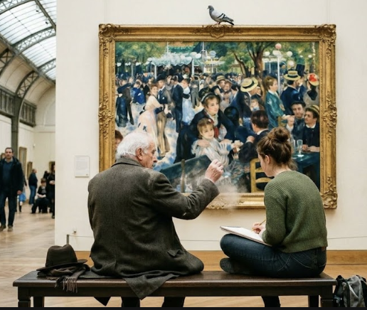 Uma jovem sentou-se ao meu lado num banco corrido do Museu d'Orsay, ao mesmo tempo que um pombo entrou inesperadamente por uma claraboia do museu e pousou, manso, sobre a moldura dourada do Renoir. Eu sacodi a manga do casaco e disse-lhe: