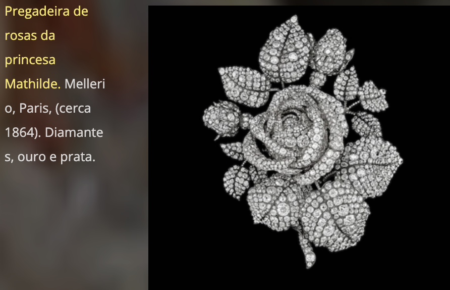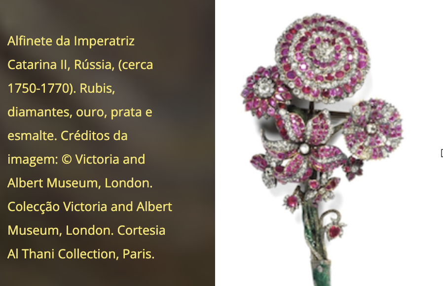 A jóia, expressão intemporal de poder e prestígio, revela-se aqui também como um objecto íntimo, portador de sentimentos e mensageiro de favores reais. A exposição reúne jóias associadas ao reinado de figuras emblemáticas da história europeia, como as imperatrizes Catarina II da Rússia, Josefina, Maria Luísa da Áustria e a rainha Vitória.